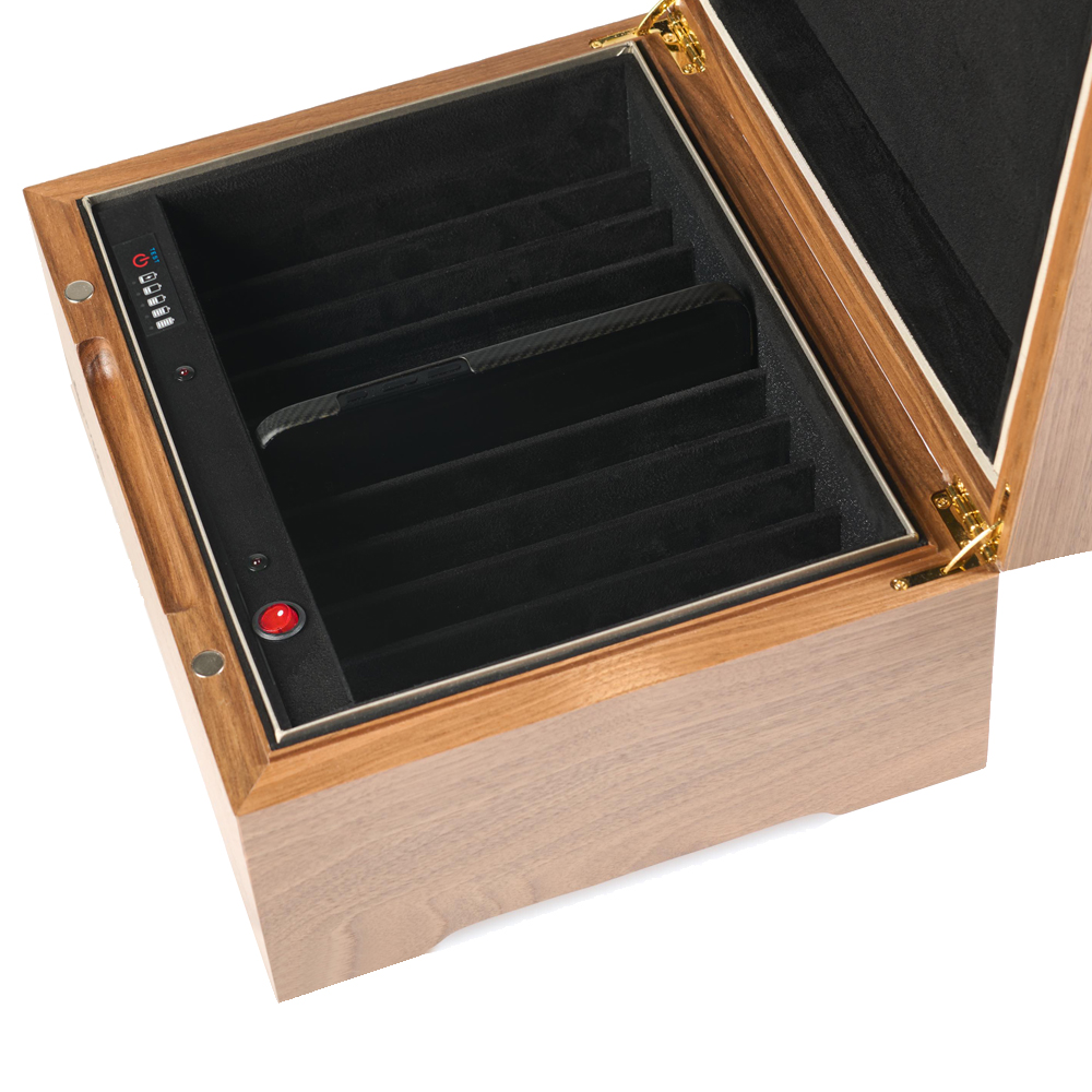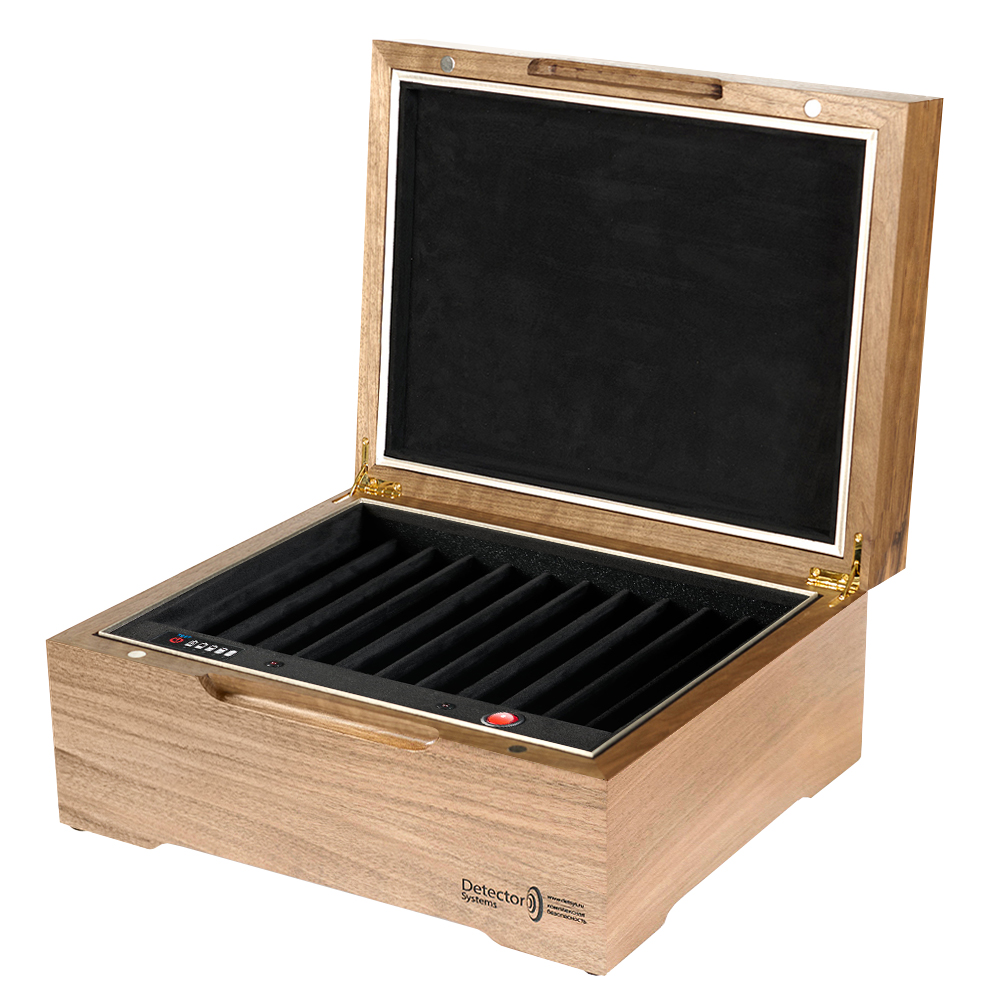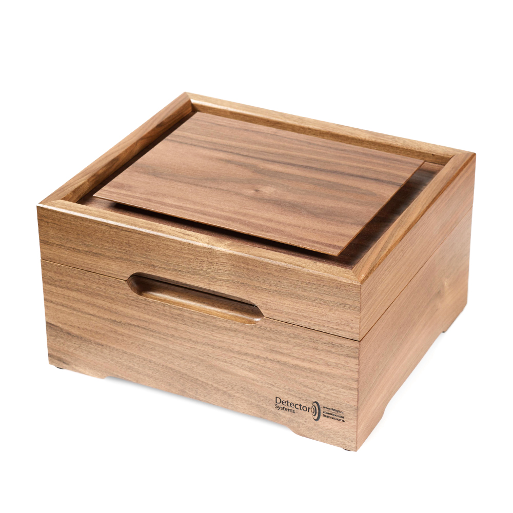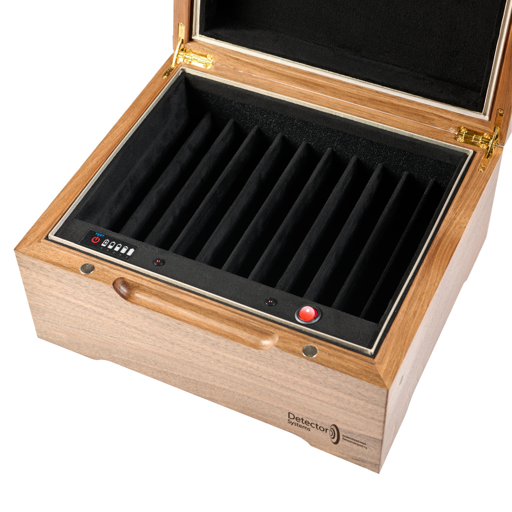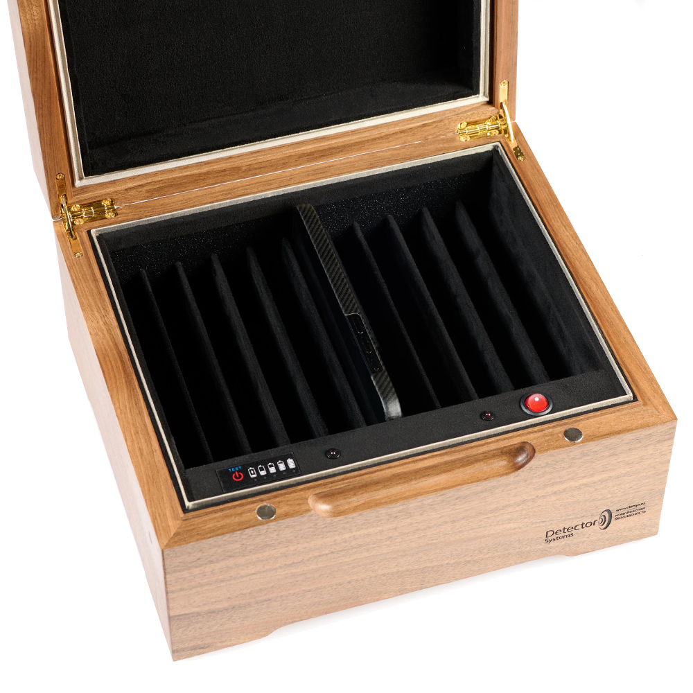 Ключевое преимущество перед обычной Шкатулкой-2/11 — абсолютная бесшумность работы. Ультразвуковая технология не создаёт фонового шума, что делает использование устройства комфортным в офисных и переговорных помещениях. При этом сохранены все достоинства основной модели: автономная работа от аккумулятора, индивидуальные экранированные отсеки для каждого телефона и элегантный дизайн из натурального дерева. Устройство просто в использовании — достаточно разместить телефоны в отсеках, включить защиту и закрыть крышку.