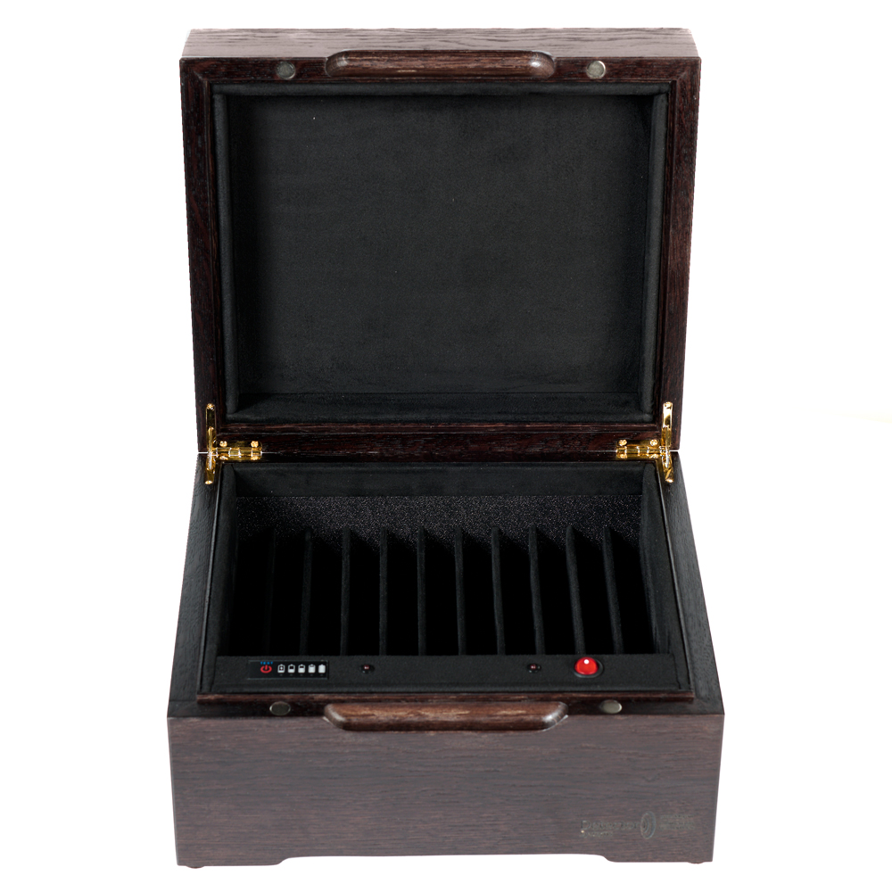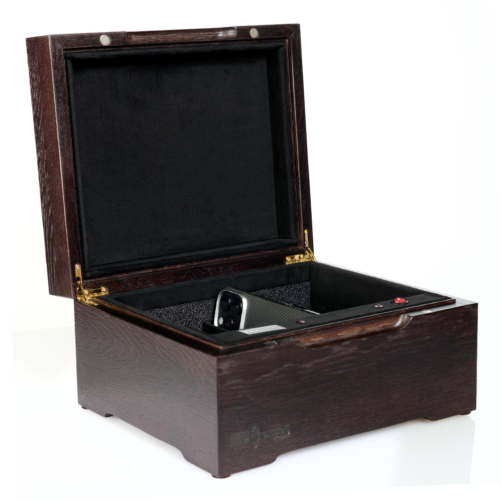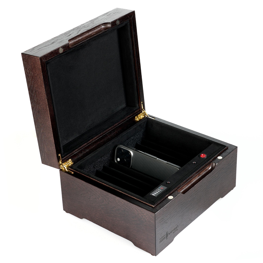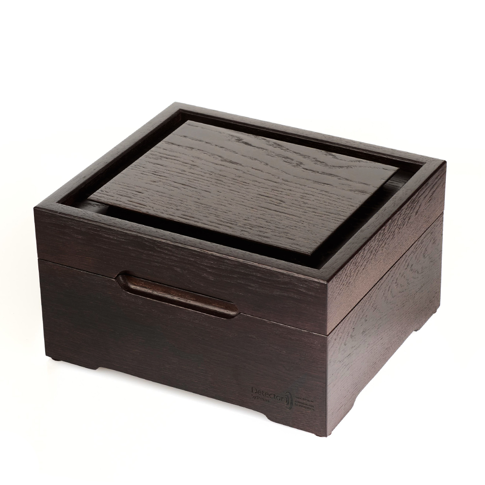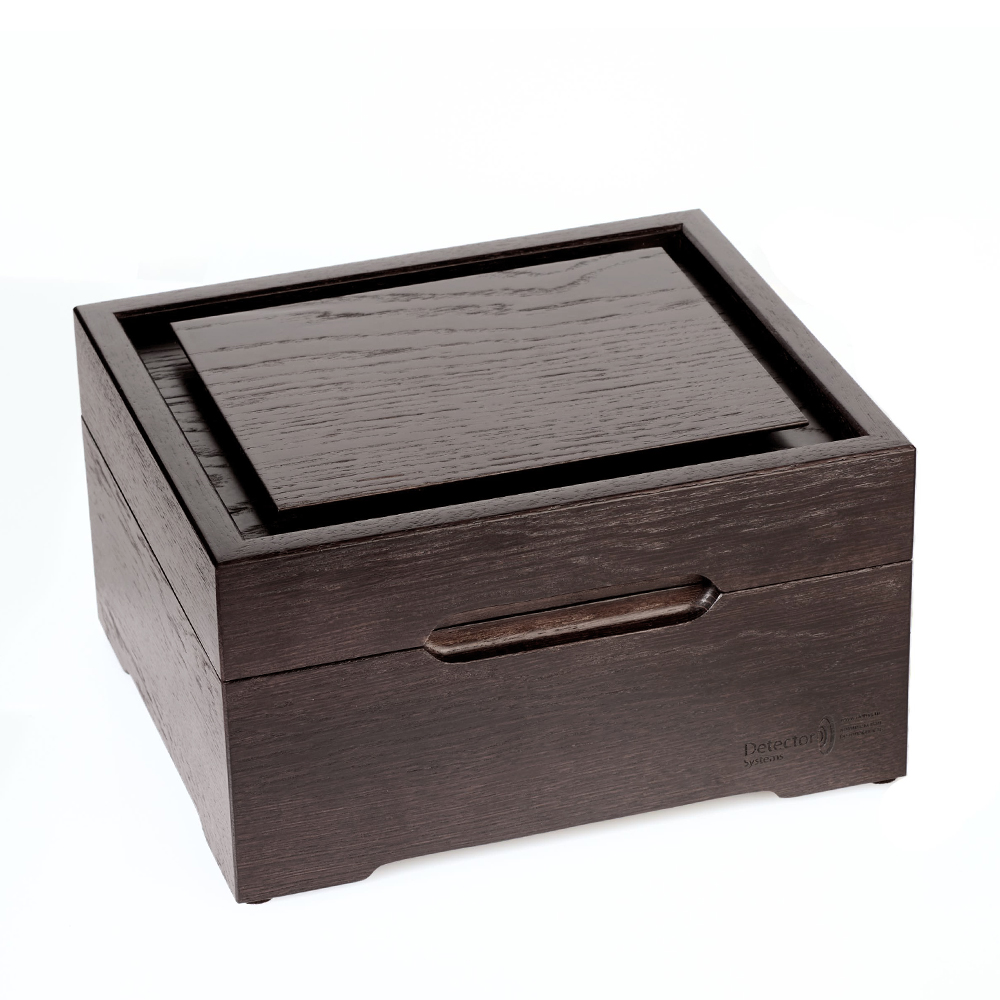 Акустический сейф Шкатулка-2/11 Ультра – это профессиональное устройство для защиты конфиденциальных переговоров, предназначенное для одновременного хранения и блокировки до 11 смартфонов. Стильный настольный бокс из массива древесины (орех или дуб) создает мощную ультразвуковую помеху, которая надежно блокирует возможность дистанционного подключения, записи через микрофон или активации диктофона. При этом телефоны остаются в сети и доступны для приема звонков. Устройство оснащено индикацией заряда батареи и эффективно подавляет все основные каналы связи. Габариты шкатулки 27х23х15 см делают ее удобной для размещения на столе.