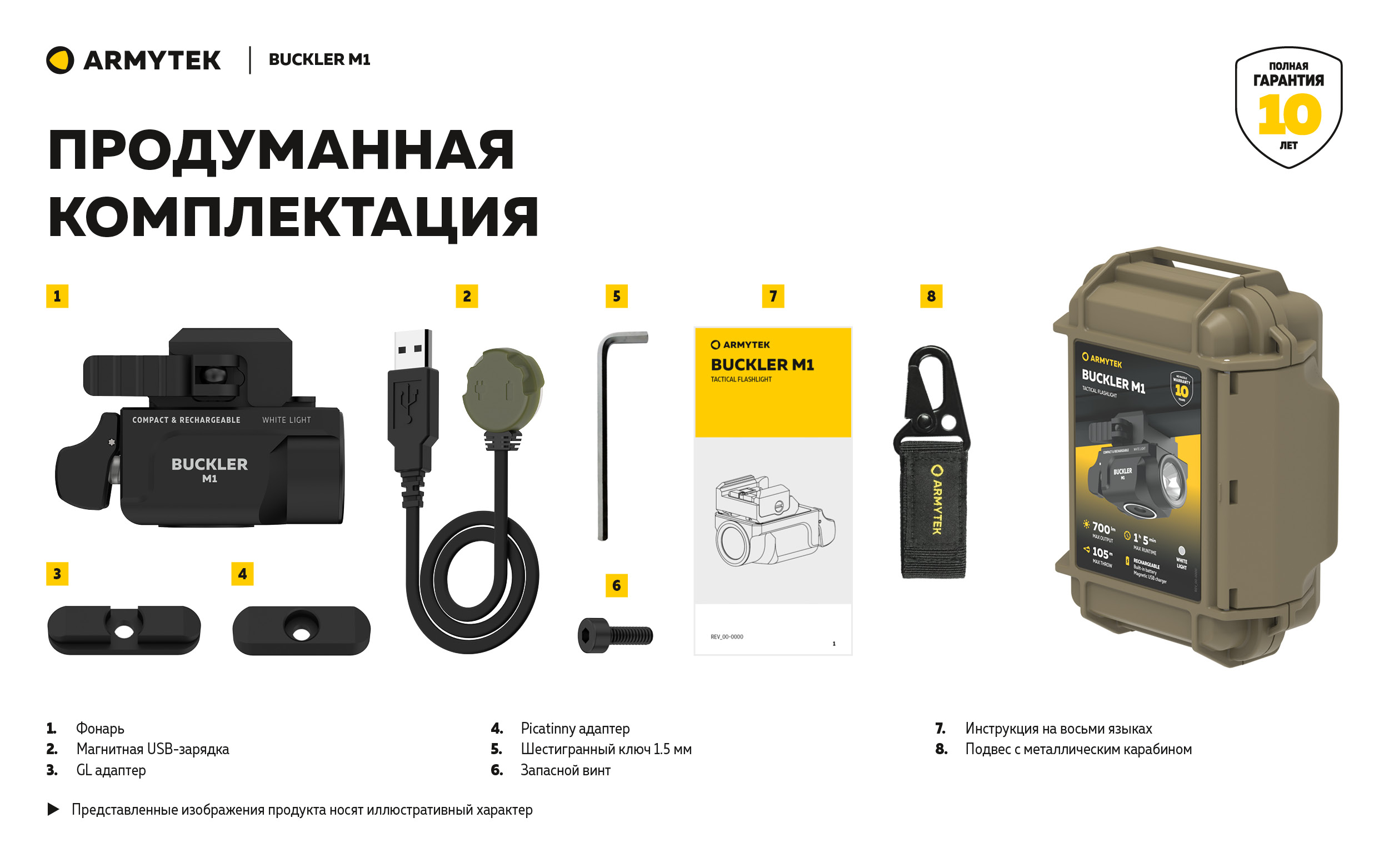 Buckler M1 оснащен емким встроенным аккумулятором Li-Pol 350 мАч. Аккумулятор удобно заряжать с помощью магнитного зарядного устройства, входящего в комплект: снимать фонарь с оружия нет необходимости. Форм-фактор и размер модели обеспечивают удобство использования с различными пистолетами. Благодаря эксцентриковому зажиму в конструкции интегрированного крепления установка осуществляется без использования дополнительных инструментов.