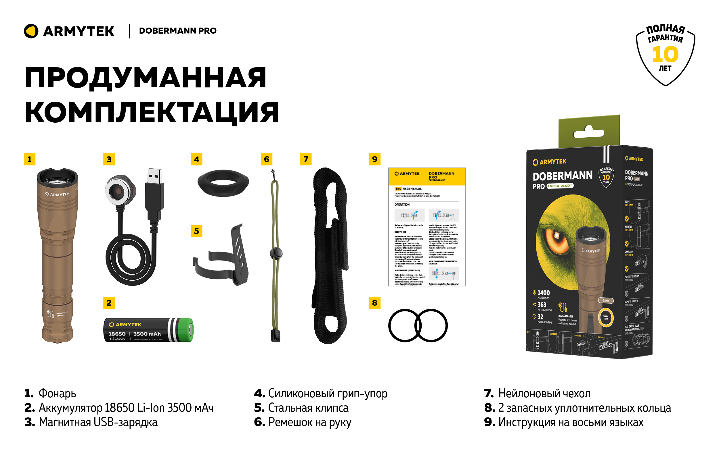 Фонарь яркостью в 1400 люмен лучше всего подходит для решения задач на средних дистанциях в 100-200 метров (максимальная дистанция света 363 метра). Dobermann Pro можно брать с собой в продолжительные поездки или на природу. Как и все модели обновленной тактической линейки, это готовое высокотехнологичное решение с аккумулятором и магнитным кабелем для зарядки от любого USB источника питания. Стандартный диаметр корпуса в 1 дюйм позволяет использовать фонарь с дополнительными тактическими аксессуарами: любыми подствольными креплениями и оригинальными выносными кнопками. Для удобного ежедневного ношения в комплект входят прочный нейлоновый чехол, стальная клипса и ремешок на руку.